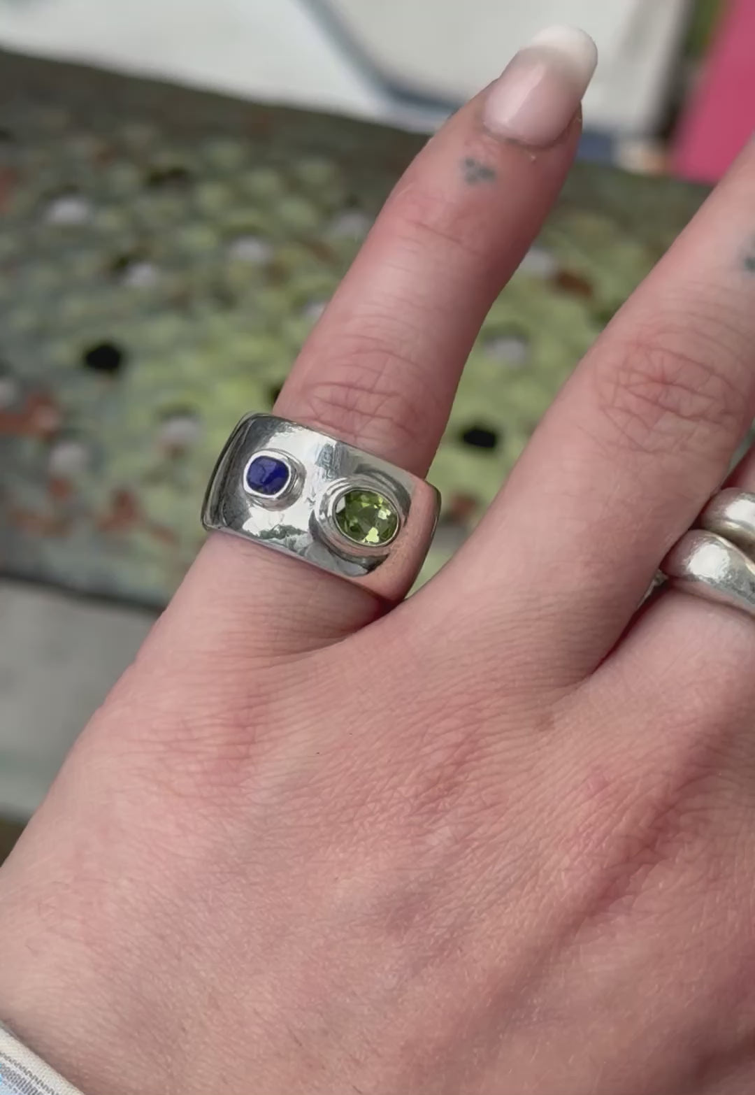 hand carved lapis lazuli face & peridot set in solid sterling silver